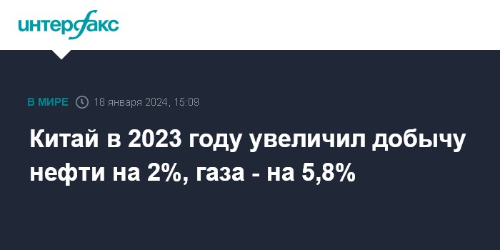 Китай в 2023 году увеличил добычу нефти на 2%, газа - на 5,8%