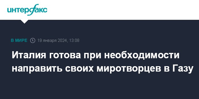 Москва. 19 января. INTERFAX.RU - Рим готов принять участие в миротворческой миссии ООН в секторе Газа, если ее согласует международное сообщество, сообщил вице-премьер и министр иностранных дел Италии Антонио Таяни.