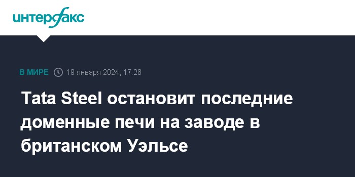 Москва. 19 января. INTERFAX.RU - Индийская сталелитейная компания состановит работу двух последних доменных печей на заводе в городе Порт-Толбот, расположенном на юге Уэльса.