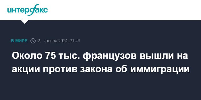 Москва. 21 января. INTERFAX.RU - Порядка 75 тыс. человек, по данным французского МВД, приняли в воскресение участие в манифестациях в разных городах Франции против нового закона об иммиграции за четыре дня до заключения по нему Конституционного совета страны.