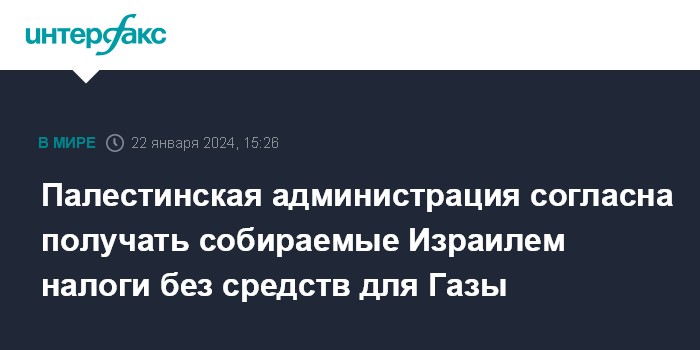Москва. 22 января. INTERFAX.RU - Палестинская национальная администрация (ПНА) согласилась получать средства от налогов, собранных Израилем от ее имени, без суммы, предназначенной для сектора Газа, сообщает The Times of Israel со ссылкой на источник.