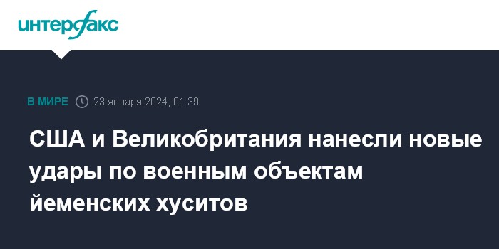 Москва. 23 января. INTERFAX.RU - США и Великобритания нанесли новые авиаудары по военным объектам хуситов в Йемене, сообщил телеканал CBS News, ссылаясь на представителей Пентагона.