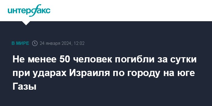 Москва. 24 января. INTERFAX.RU - За прошедшие сутки как минимум 50 человек погибли, еще 120 пострадали в ходе ударов Израиля по городу Хан-Юнис на юге сектора Газа, сообщает агентство WAFA со ссылкой на источники среди медицинских работников в анклаве.