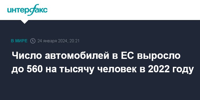 Москва. 24 января. INTERFAX.RU - Среднее число легковых автомобилей в Европейском союзе в 2022 году в расчете на 1 тыс. населения составляло 560, по данным статистического управления ЕС.
