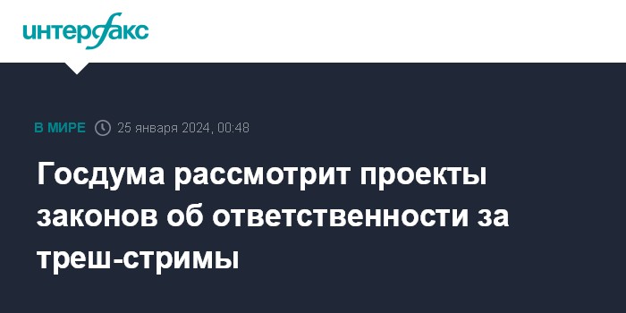 Москва. 25 января. INTERFAX.RU - Госдума в четверг рассмотрит в первом чтении проекты законов, направленные на противодействие распространению в информационном пространстве деструктивного контента в виде треш-стримов.