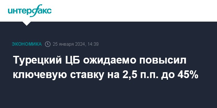 Москва. 25 января. INTERFAX.RU - Центробанк Турции на заседании в четверг поднял ключевую процентную ставку на 2,5 процентного пункта (п.п.).
