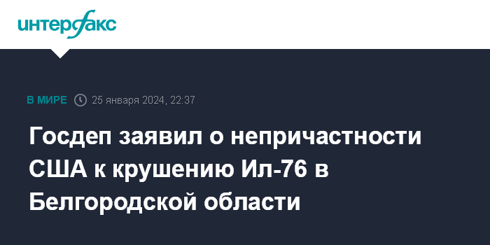 Москва. 25 января. INTERFAX.RU - США не имеют отношения к крушению российского военно-транспортного самолета Ил-76 с украинскими военнопленными на борту в Белгородской области, заявил в четверг на брифинге представитель Госдепартамента Ведант Патель.