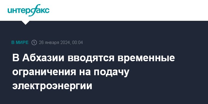 Москва. 26 января. INTERFAX.RU - В западной части Абхазии и в столице республики Сухуме с 26 по 31 января вводятся ограничения на подачу электроэнергии, сообщила абхазская энергетическая компания "Черноморэнерго".