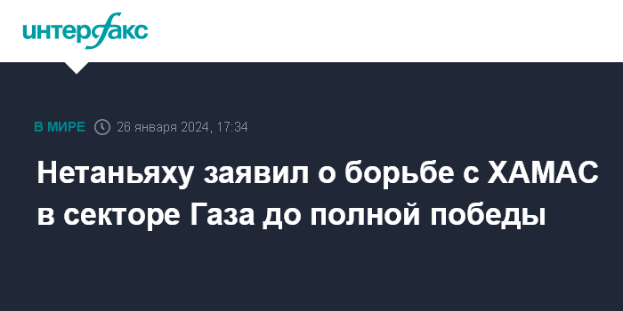 Москва. 26 января. INTERFAX.RU - Израиль продолжит борьбу против группировки ХАМАС в секторе Газа и намерен сражаться с ней до полной победы, заявил премьер-министр страны Биньямин Нетаньяху после оглашения предварительного решения суда ООН по иску ЮАР.
