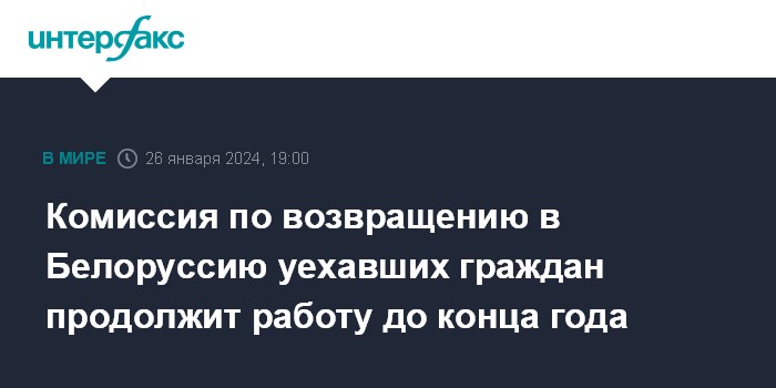 Москва. 26 января. INTERFAX.RU - В Белоруссии продлена работа комиссии по вопросам возвращения в страну уехавших граждан, в том числе участников протестов, проходивших после президентских выборов 2020 года, сообщил близкий к пресс-службе президента страны телеграм-канал "Пул Первого".