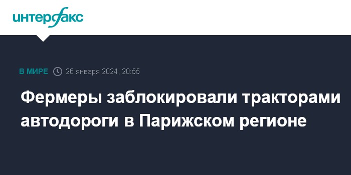 Москва. 26 января. INTERFAX.RU - Фермеры во Франции с 14 часов по местному времени и до полуночи проводят акцию протеста в Парижском регионе, сообщают французские СМИ. По их оценкам, около 200 тракторов в настоящее время находится на дорогах, ведущих в столицу и ее окрестности.