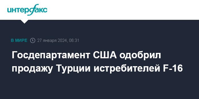 Москва. 27 января. INTERFAX.RU - Американский госдепартамент уведомил Конгресс, что одобрил продажу истребителей F-16 и сопутствующего оборудования Турции на сумму $23 млрд, сообщила The New York Times.