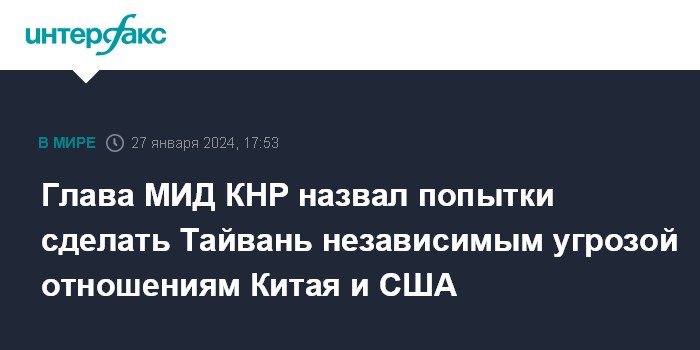 Москва. 27 января. INTERFAX.RU - Попытки сделать Тайвань независимым от Китая представляют наибольшую угрозу отношениям КНР и США, заявил глава китайского МИД Ван И на переговорах в Бангкоке с советником президента США по нацбезопасности Джейком Салливаном.