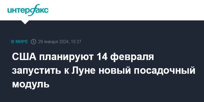 Москва. 29 января. INTERFAX.RU - Запуск к Луне американского посадочного аппарата Nova-C техасской компании Intuitive Machines в рамках контракта с NASA планируется осуществить 14 февраля, сообщило специализированное издание Rocket Launch.