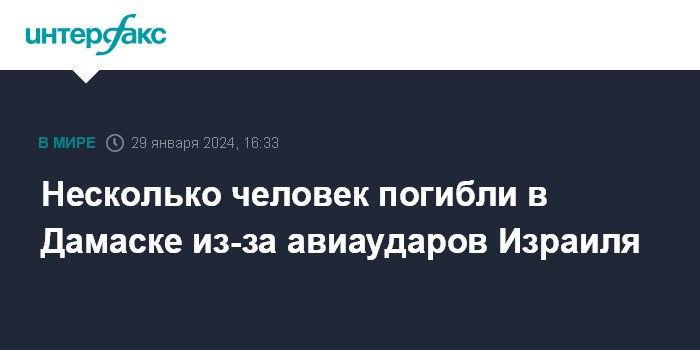 Москва. 29 января. INTERFAX.RU - Израиль нанес несколько авиаударов на юге Дамаска, в результате которых несколько человек погибли, передает в понедельник агентство SANA со ссылкой на источник в сирийских вооруженных силах.