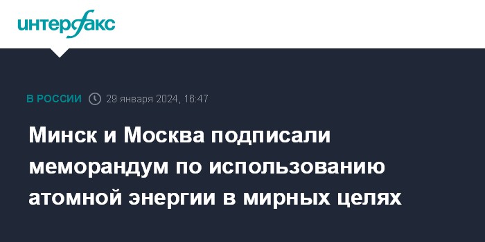 Москва. 29 января. INTERFAX.RU - Меморандум между правительствами Белоруссии и России об углублении стратегического сотрудничества в области использования атомной энергии в мирных целях и смежных высоких технологий подписан 29 января в Санкт-Петербурге.
