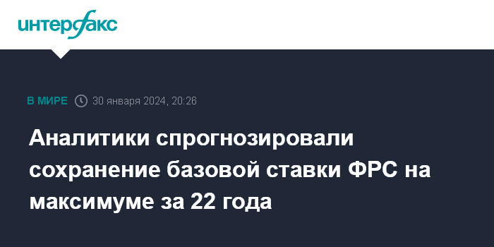 Москва. 30 января. INTERFAX.RU - Федеральная резервная система (ФРС) США по итогам январского заседания, которое завершится в среду, сохранит размер процентной ставки по федеральным кредитным средствам в диапазоне 5,25-5,5% годовых – максимальном за 22 года, прогнозирует большинство аналитиков и экономистов.