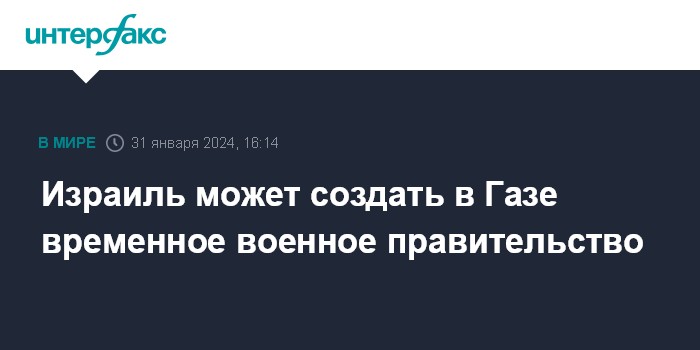 Москва. 31 января. INTERFAX.RU - Израиль рассматривает возможность создания в секторе Газа временного израильского военного правительства, которое после завершения военной операции будет некоторое время отвечать за гуманитарные нужды, сообщили в среду израильские СМИ.
