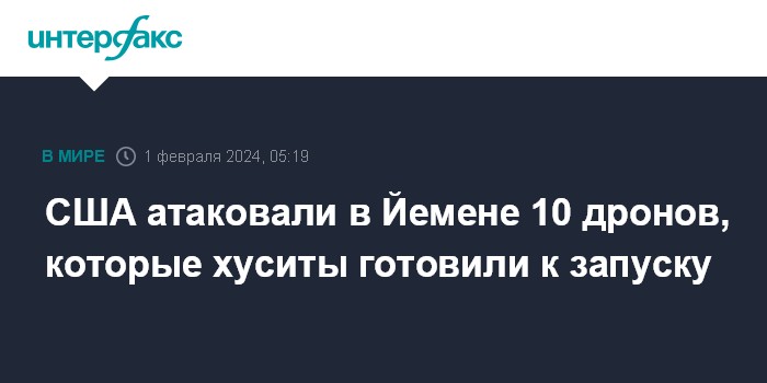 CBS News со ссылкой на высокопоставленного представителя министерства обороны Бахрейна уточняет, что США нанесли удар по 10 готовящимся к запуску беспилотникам на западе Йемена.