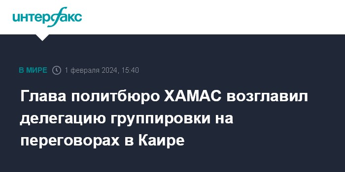 Москва. 1 февраля. INTERFAX.RU - Глава политбюро ХАМАС Исмаил Хания возглавил делегацию группировки на переговорах в Каире о возможном перемирии в секторе Газа, сообщают ближневосточные СМИ. По их данным, Хания встречается в Каире с главой египетских разведслужб Аббасом Камелем.