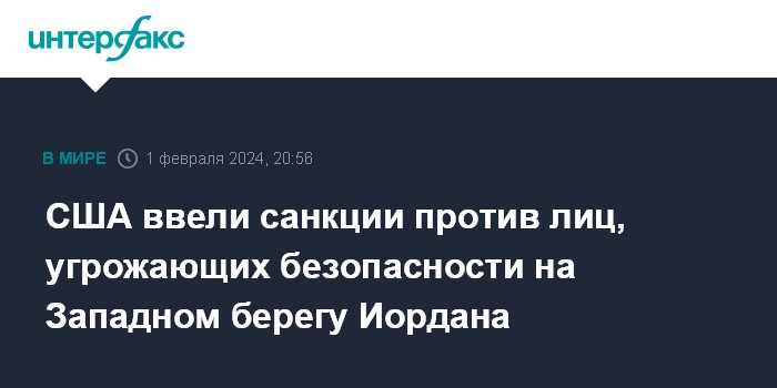 Москва. 1 февраля. INTERFAX.RU - Президент США Джо Байден в четверг проинформировал Конгресс о решении ввести санкции против лиц, действия которых подрывают мир, безопасность и стабильность на Западном берегу реки Иордан.