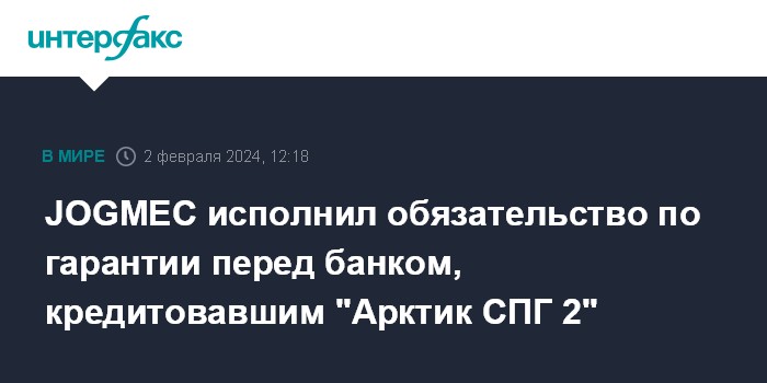 Москва. 2 февраля. INTERFAX.RU - Японская JOGMEC исполнила обязательство по гарантии долга на 814 млн евро перед банком, кредитовавшим проект "Арктик СПГ 2", подпавший под американские санкции, передает агентство Bloomberg заявление компании.