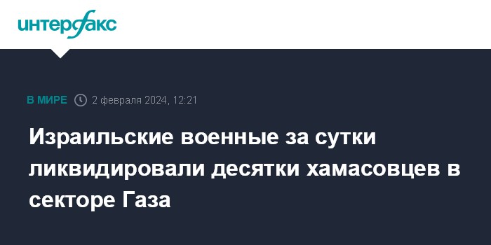 Москва. 2 февраля. INTERFAX.RU - Сухопутные войска Армии обороны Израиля (ЦАХАЛ) в координации с ВВС продолжают ликвидировать боевиков ХАМАС и их инфраструктуру во всех частях сектора Газа, сообщает в пятницу телеграм-канал ЦАХАЛ; по данным израильских военных, за прошедшие сутки было ликвидировано несколько десятков боевиков.