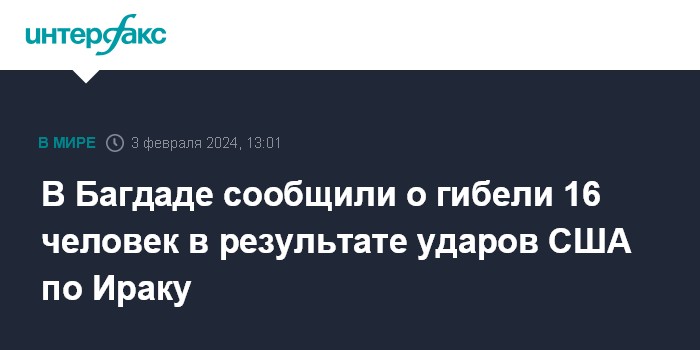 Москва. 3 февраля. INTERFAX.RU - Удары, нанесенные США по целям в Ираке, привели к гибели шестнадцати человек, сообщили в субботу в иракском правительстве.