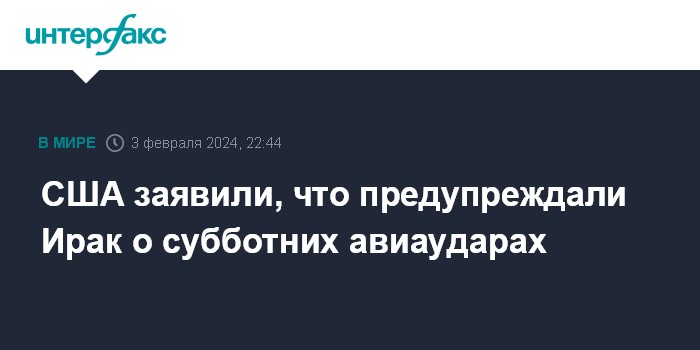 Москва. 3 февраля. INTERFAX.RU - Ирак получил заранее предупреждение о намерениях Соединенных Штатов нанести авиаудары по целям на иракской территории, сообщает NBC со ссылкой на чиновника в администрации США.