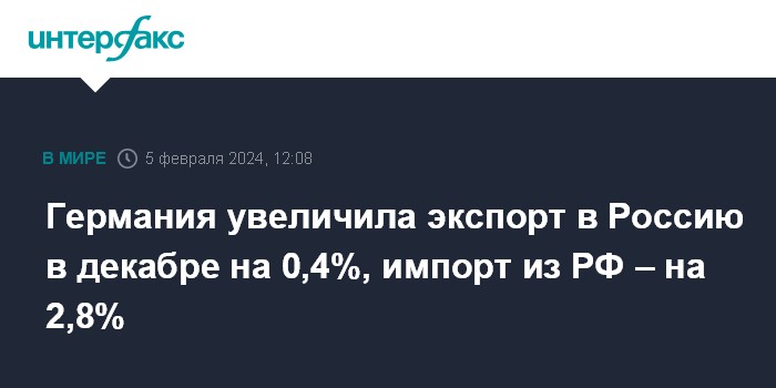 Москва. 5 февраля. INTERFAX.RU - Германия увеличила экспорт в Россию в декабре на 0,4% по сравнению с ноябрем – до 700 млн евро, говорится в отчете Федерального статистического управления ФРГ (Destatis).