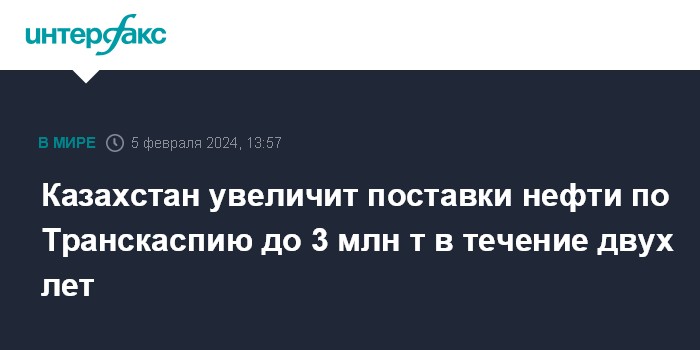 Москва. 5 февраля. INTERFAX.RU - Казахстан намерен в течение двух лет довести объем поставок нефти по Транскаспийскому маршруту до 3 млн тонн, сообщила пресс-служба казахстанского правительства.