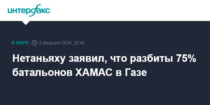 Москва. 5 февраля. INTERFAX.RU - Премьер-министр Израиля Биньямин Нетаньяху заявил, что Армия обороны Израиля разгромила 75% батальонов террористической группировки ХАМАС в секторе Газа, пишет газета The Times of Israel.