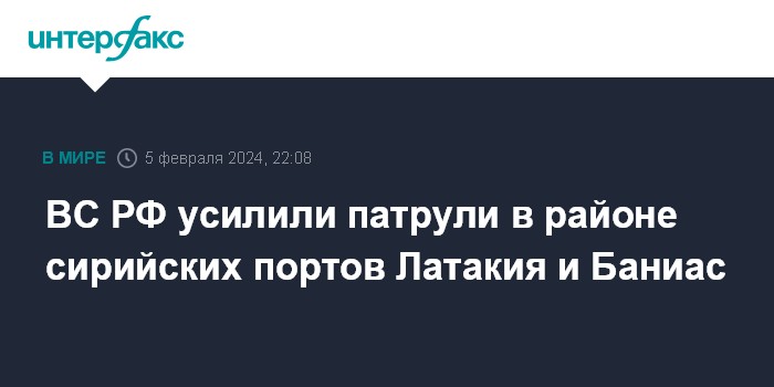 Москва. 5 февраля. INTERFAX.RU - Российские военные сообщили об усилении патрулей в районе сирийских портов Латакия и Баниас.