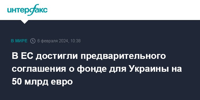 Москва. 6 февраля. INTERFAX.RU - Совет ЕС и Европарламент объявили в ночь на вторник, что согласовали новый механизм поддержки Украины на 50 млрд евро на период 2024-2027 годов.