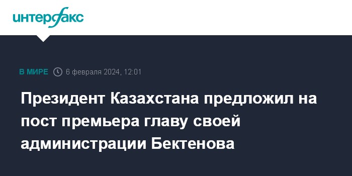Москва. 6 февраля. INTERFAX.RU - Президент Казахстана Касым-Жомарт Токаев предложил мажилису парламента на пост премьер-министра Олжаса Бектенова, возглавляющего администрацию президента.