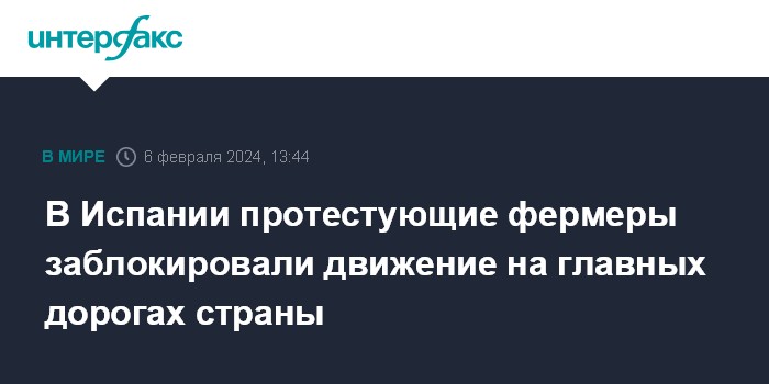 Москва. 6 февраля. INTERFAX.RU - Протестующие фермеры перекрыли движение на основных автомагистралях Испании, сообщает во вторник телеканал RTVE.