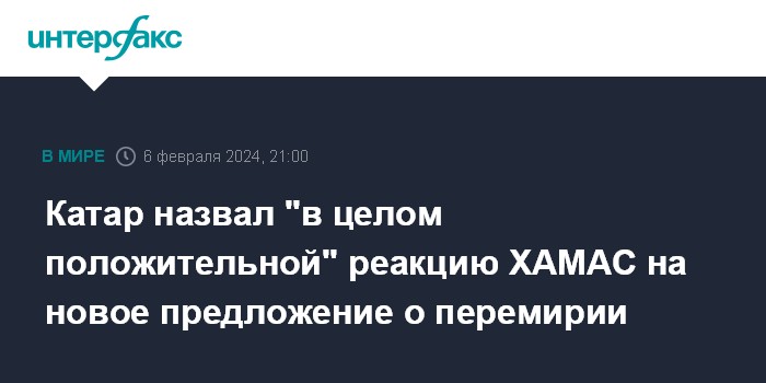 Москва. 6 февраля. INTERFAX.RU - Премьер и глава МИД Катара Мухаммед бен Абдель Рахман аль Тани во вторник заявил, что группировка ХАМАС дала в целом положительный ответ на новое предложение о соглашении с Израилем по вопросу обмена заложниками и заключенными с Израилем.