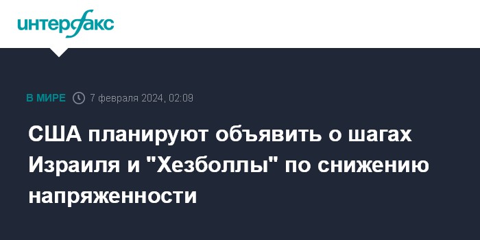 Москва. 7 февраля. INTERFAX.RU - США и четыре их союзника из ЕС надеются объявить в ближайшие несколько недель о ряде обязательств, взятых Израилем и "Хезболлой" по ослаблению напряженности и восстановлению спокойствия на израильско-ливанской границе, сообщает Axios со ссылкой на осведомленные источники.