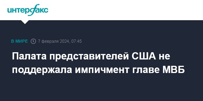 Москва. 7 февраля. INTERFAX.RU - Палата представителей США не поддержала импичмент главы министерства внутренней безопасности США Алехандро Майоркаса, свидетельствуют результаты голосования.
