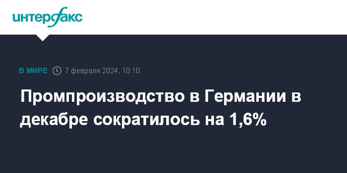 Промпроизводство в Германии в декабре сократилось на 1,6%