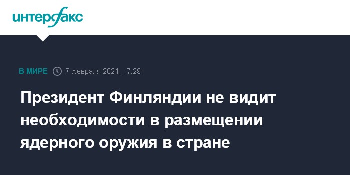 Москва. 7 февраля. INTERFAX.RU - Президент Финляндии Саули Ниинистё (Sauli Niinisto) отверг необходимость обсуждения о возможности размещения ядерного оружия на территории страны.