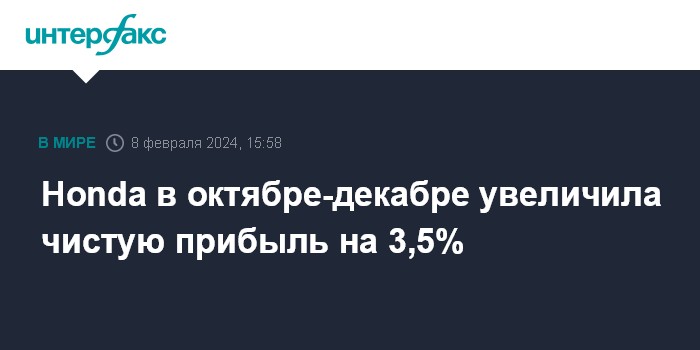 Москва. 8 февраля. INTERFAX.RU - Японский автопроизводитель Honda Motor Co. в третьем квартале 2024 финансового года увеличил чистую прибыль на 3,5%, а также улучшил годовой прогноз.