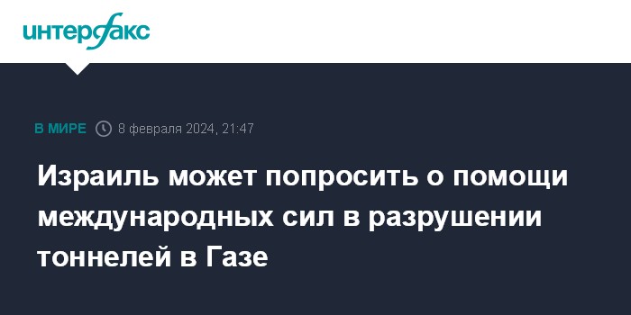 Москва. 8 февраля. INTERFAX.RU - Израиль может запросить помощь у международных сил, чтобы завершить операцию по разрушению сети подземных тоннелей в секторе Газа, сообщает в четверг The Jerusalem Post со ссылкой на источники.