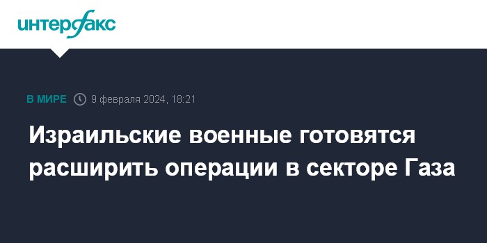 Москва. 9 февраля. INTERFAX.RU - Израильские военные готовятся расширить масштаб операций в секторе Газа, заявил проводят подготовку к расширению операций в секторе Газа, заявил глава Северного командования Армии обороны Израиля (ЦАХАЛ) Ори Гордин. Об этом пишет The Times of Israel.