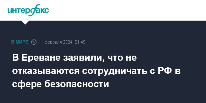 Москва. 11 февраля. INTERFAX.RU - Армения не отвергает сотрудничество с Россией в области безопасности, однако обсуждает и работает над установлением таких отношений с другими странами, заявил армянский премьер-министр Никол Пашинян.