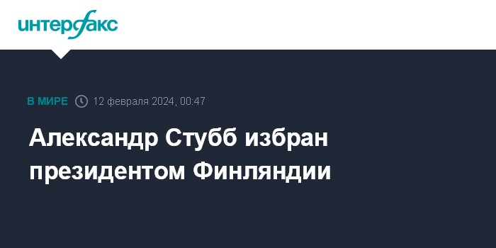 Москва. 12 февраля. INTERFAX.RU - Бывший премьер-министр Финляндии Александр Стубб победил во втором туре президентских выборов, набрав 51,6% голосов после подсчета всех бюллетеней, сообщает портал Yle.