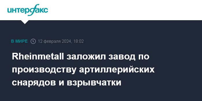 Москва. 12 февраля. INTERFAX.RU - Немецкий оборонный концерн Rheinmetall AG начал строительство в федеральной земле Нижняя Саксония нового предприятия, на котором будут выпускать артиллерийские снаряды, взрывчатку и компоненты реактивной артиллерии, говорится в пресс-релизе концерна.
