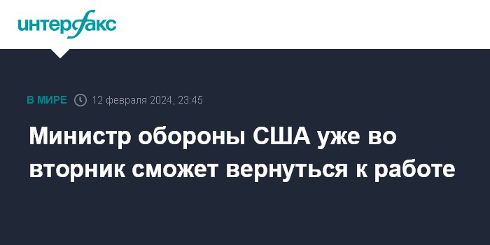 Москва. 12 февраля. INTERFAX.RU - Шеф Пентагона Ллойд Остин прошел нехирургическое лечение связанных с мочевым пузырем осложнений, он сможет вернуться к работе уже во вторник.