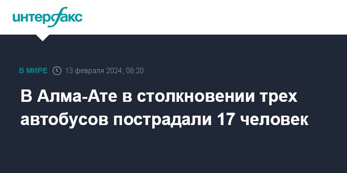 Москва. 13 февраля. INTERFAX.RU - В Алма-Ате на проспекте Райымбека столкнулись три рейсовых автобуса и легковой автомобиль. Как сообщила пресс-служба городского Управления общественного здоровья, травмы получили 17 человек.