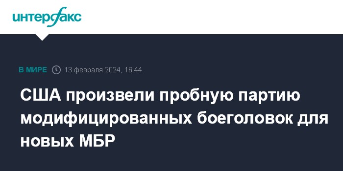 Москва. 13 февраля. INTERFAX.RU - Соединенные Штаты произвели первую опытную партию модифицированных ядерных боеголовок W87-1 для оснащения перспективной межконтинентальной баллистической ракеты шахтного базирования LGM-35 Sentinel, следует из данных ежегодного отчета Национального управления ядерной безопасности (NNSA).